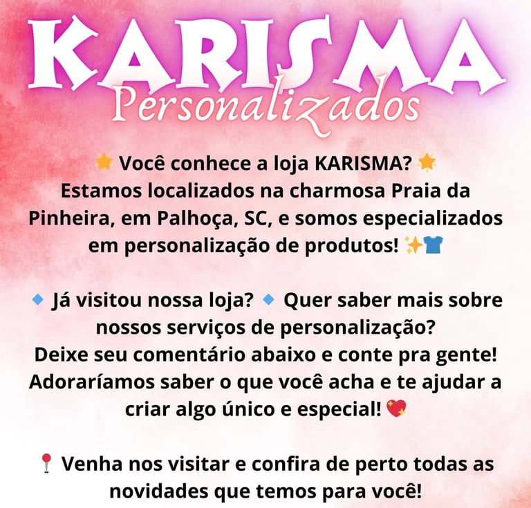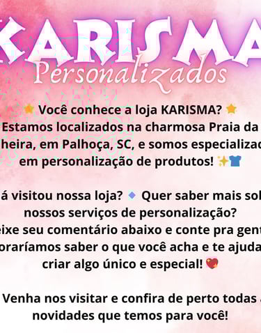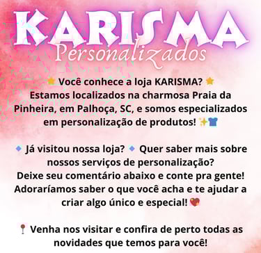 A Karisma Papelaria e Personalizados é uma loja localizada na Praia da Pinheira, Palhoça/SC, especializada em transformar ideias em produtos criativos. Trabalhamos com papelaria, personalizados, livraria e brindes corporativos, e também com Marketing e Propaganda , Além de Cursos. Aqui você pode personalizar tudo do seu jeito e receber um atendimento rápido e humano